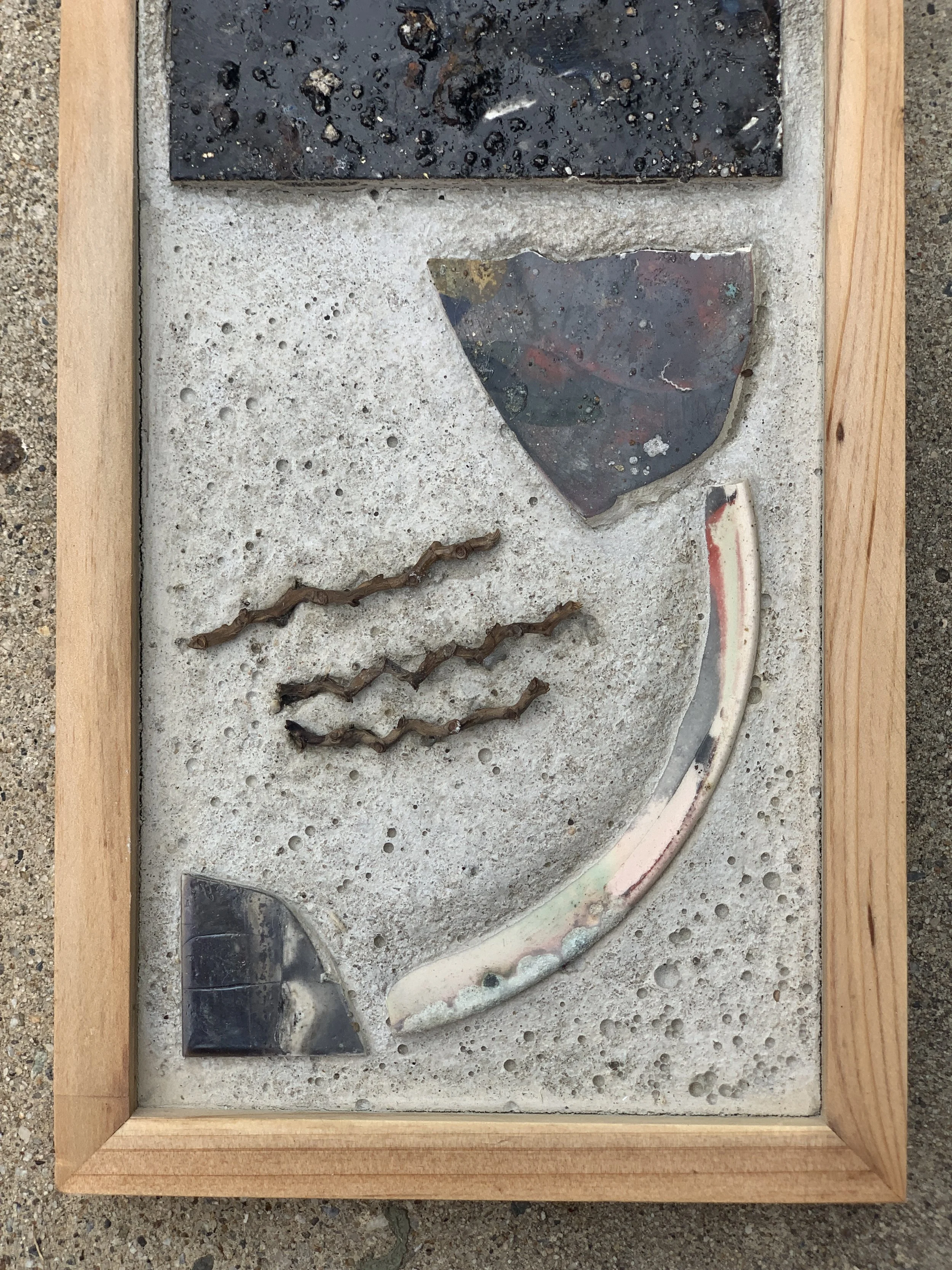 Family Heirlooms (detail), 2025. Salvaged tile, ceramic shards, concrete, wood.