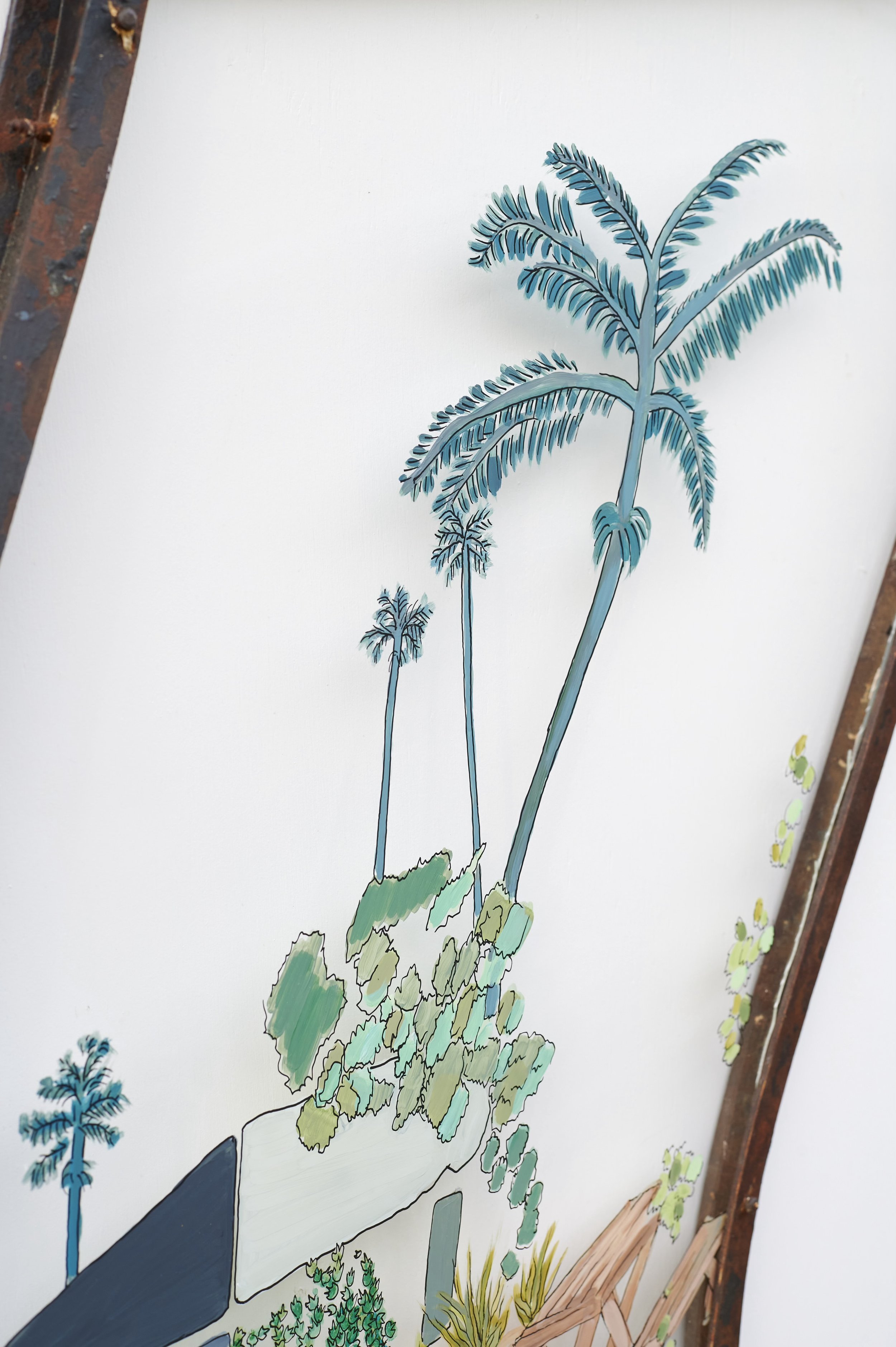 Paradise Evacuated (detail), 2026. Salvaged steel window, acrylic, acrylic panel.